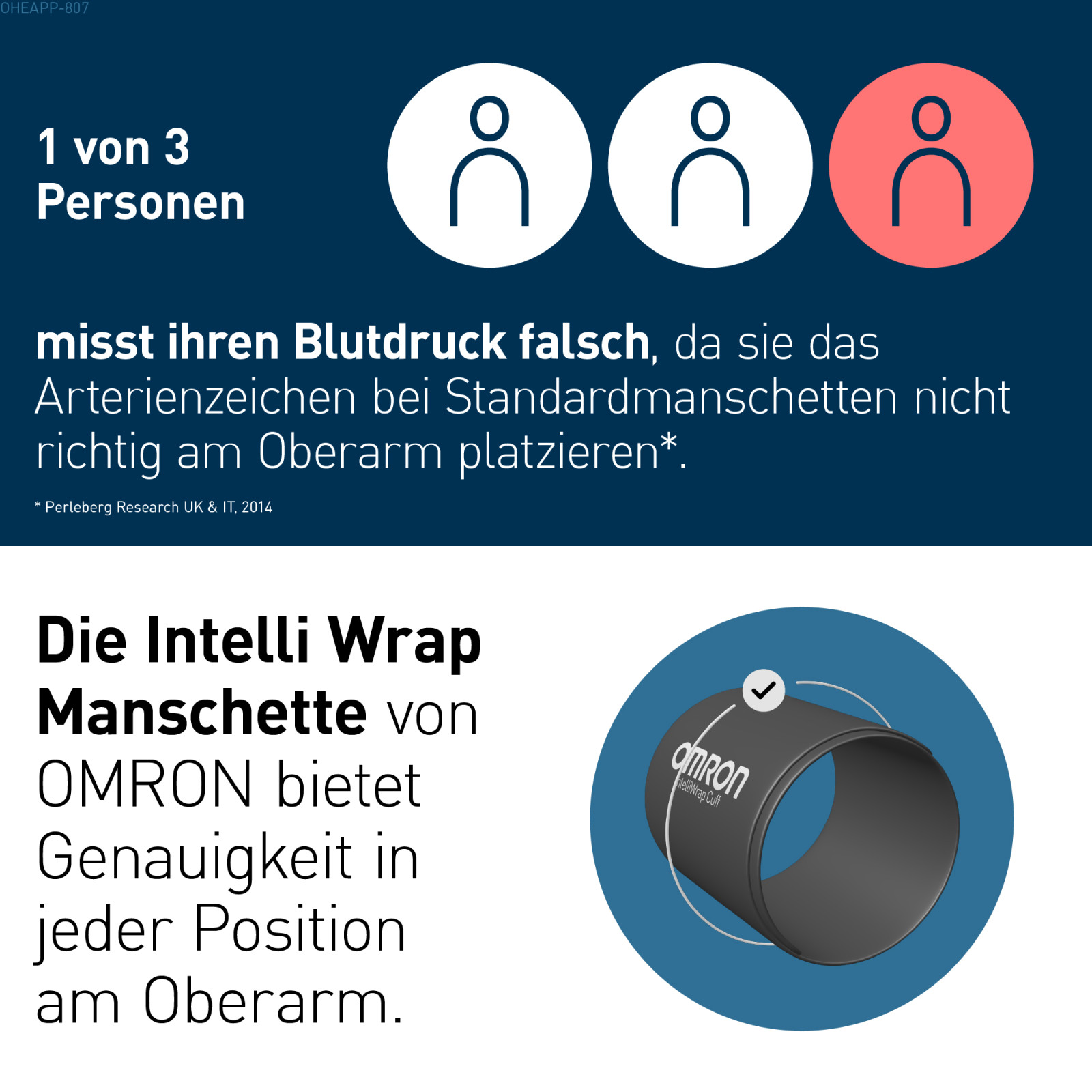 Es wird mit einer Intelli Wrap-Manschette (22–42 cm) geliefert, die präzise Messungen in jeder Position am Oberarm gewährleistet. Dies hilft, häufige Anwendungsfehler bei der Manschettenplatzierung zu vermeiden und macht das Gerät besonders geeignet für Erstnutzer.