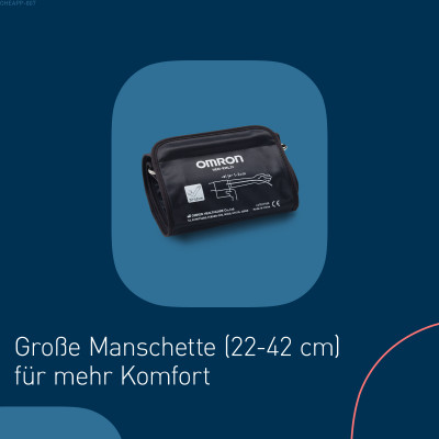 Die Universal-Manschette (22–42 cm) passt sich einer Vielzahl von Armgrößen an und liefert zuverlässige Ergebnisse. Funktionen wie die Erkennung von unregelmäßigem Herzschlag und Körperbewegungen tragen zusätzlich dazu bei, Messfehler zu vermeiden und somit die Messgenauigkeit zu erhöhen.
