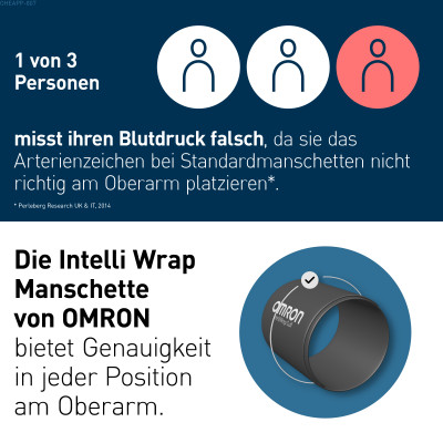 Es wirdt mit der Intelli Wrap-Manschette (22–42 cm) geliefert, die präzise Messwerte in jeder Position um den Oberarm gewährleistet. Dies hilft, häufige Fehler durch falsches Anlegen der Manschette zu vermeiden, was das Gerät besonders für Erstnutzer geeignet macht.